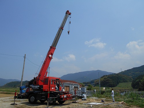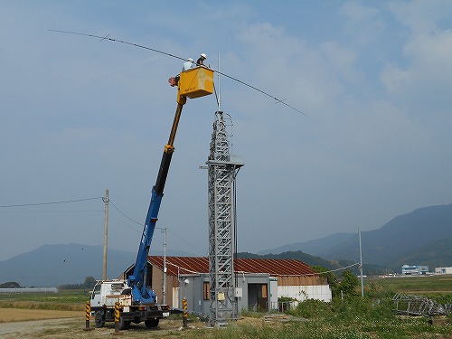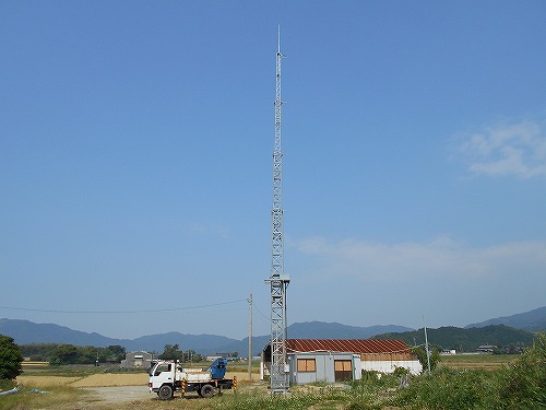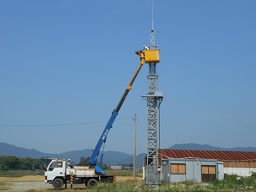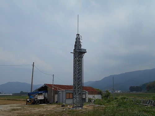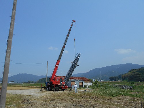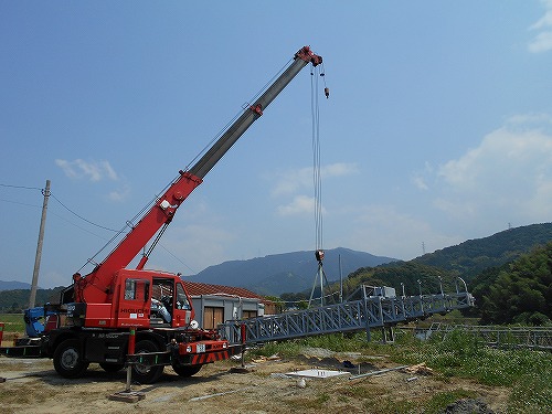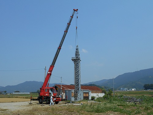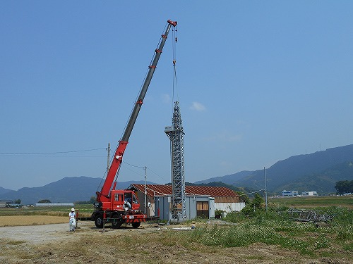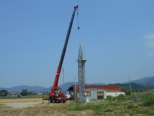 今日はタワーの建込日です。 13:30にクレーン車が到着しました。 作業は順調に進み、アンカーボルトも修正することなく建込を終了しました。 その後、負荷をかけた状態で点検やグリスアップをしました。 今日の作業はこれで終わりです。 (2015/05/29) |