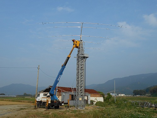 午前中、携帯基地局の改修工事の仕事があり、帰社して午後からのアンテナ取付となりました。 以前に事務所内で組み立てておいたエレメントを倉庫から出庫して取付作業を行いました。 ブーム長9.9m エレメント最長14.5m 重量約40kg あります。 クリエート・デザイン 714X 明日は接続・調整・試験を行う予定です。 (2015/06/01) |