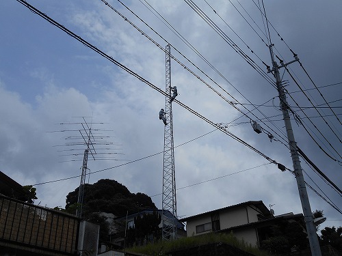 今日は、C社のKT−20Rタワーの組上げです。 朝から大雨警報が発令されて天気が悪く一旦は作業を延期としたものの、雨がやみ、