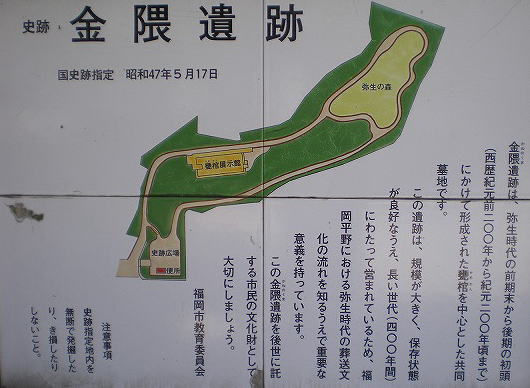 福岡平野における弥生時代の葬送文化の流れを知るうえで重要な意義を持っています。この金隈遺跡を後世に託する市民の文化財