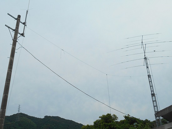 | 週間予報では本日はまとまった雨とのことでしたので、工事を延期していましたが雨は降らず。梅雨期は本当に予定が立てにくいです。時間ができましたのでケーブルの通線と先日草刈りの時に切断した電源線の修復とタワーとコンクリート柱を利用してして10MHzDPアンテナを作りました。エレメントワイヤーは5.5SQで部品は有るもの利用です。 | ![]() |