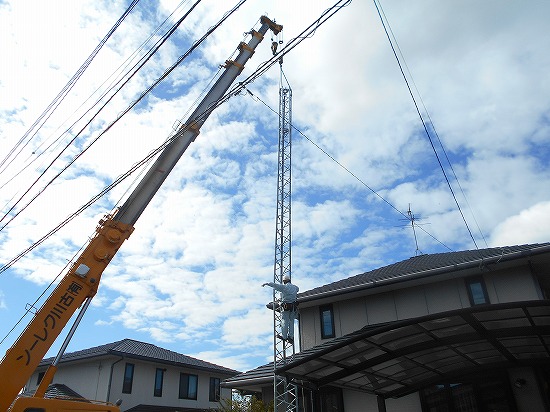 8月2日に工事にお伺いし、支線用のリングスクリューアンカーを梯子で取付し、屋根上に上がろうとしたところ、天候がよく、屋根の温度が手がつけないほど熱く焼けており、作業断念。 見通しが甘かった・・・。 それで、次の週は台風通過により中止し、昨日と本日午前中で工事が終了しました。 ルーフタワーを設置してHFのGPアンテナとU/VのGPアンテナの設置です。このときは、高所作業車を使用したので、屋根上の作業や他の作業も安全に行うことができました。 高所作業車は1台で数人分の仕事はしますね。 屋根上の作業はとても危険なのです。転落対策を十分にしておかないといけませんが、なかなかロープを(親綱)張るにも難易度が高く、対策がしにくいのが現実です。昔は仲間を集めて工事をしていることが多かったようですが、危険なので、ハムショップさん等へ相談して施工をしてもらった方が良いと思います。 午後から北九州市へタワー建設の御見積調査へ行きました。 |